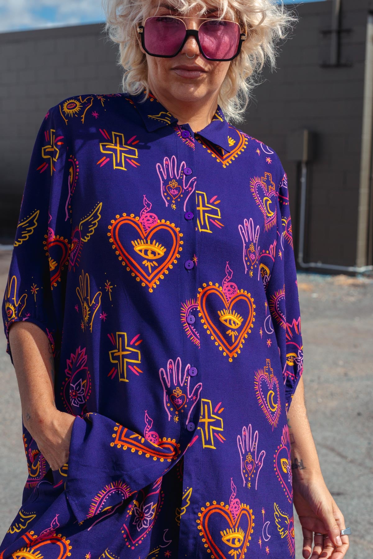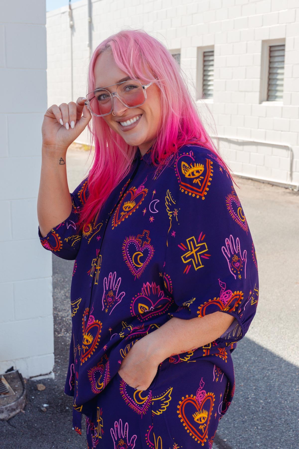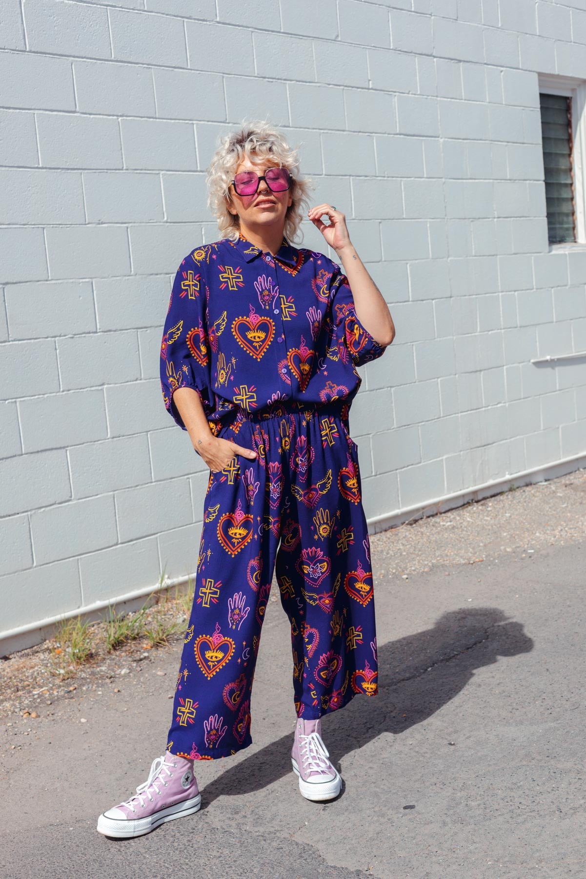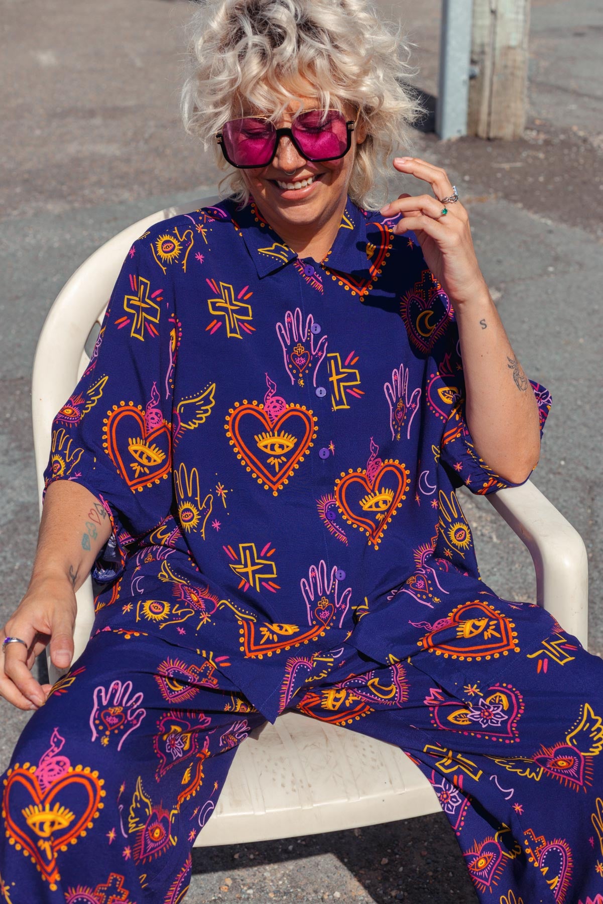 An Indigo base to really make the multicoloured print pop in a cool as heck print with a lot of colour to really make it sing. Check out this style as well as the matching SACRED HEART SHIRT in our BRIXTON style to match perfectly with these PANTS.
