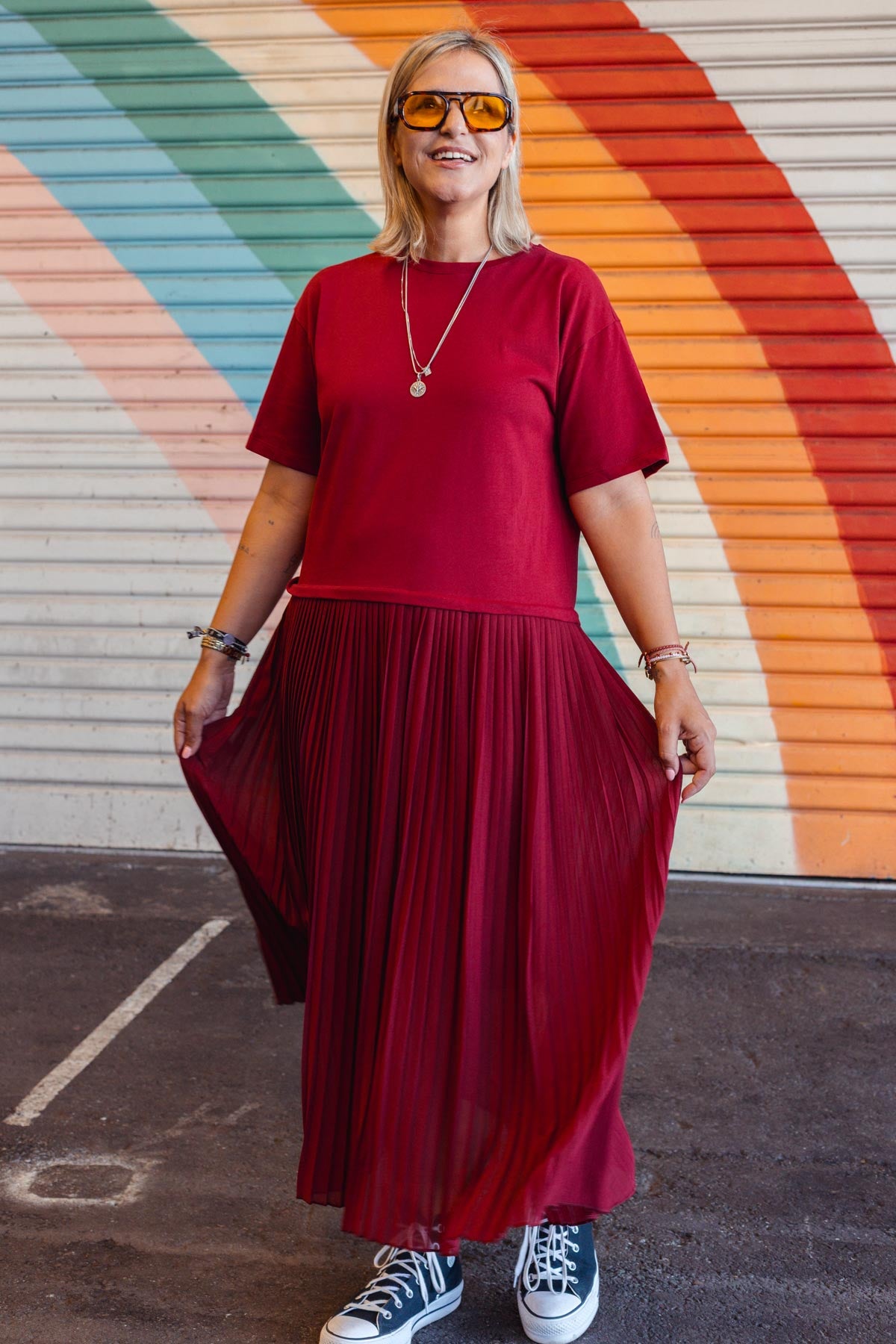 What a funky combo of boxy relaxed shirt style combined with a delicate pleated skirt to make this absolute seasonal MUST HAVE! These look so good paired with some fresh kicks and understated styling or easily dressed up for the occasion with a heel.