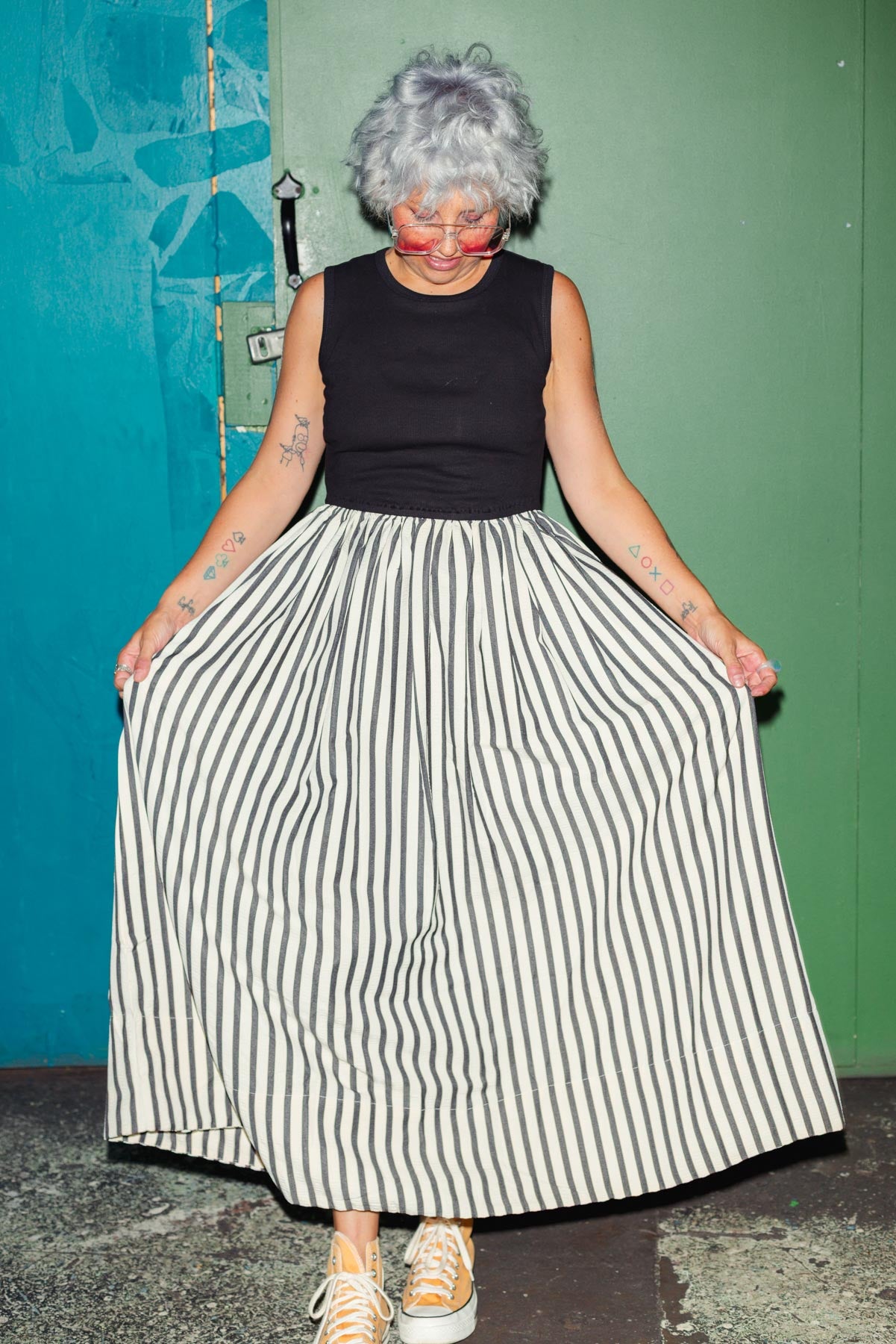 We are absolutely swooning over this latest addition to the SS collection the all new DELLA DRESS in NATURAL STRIPE is a gorgeous mix of stretchy black top and gorgeous flowy and full skirt in a gorgeous earthy stripe.