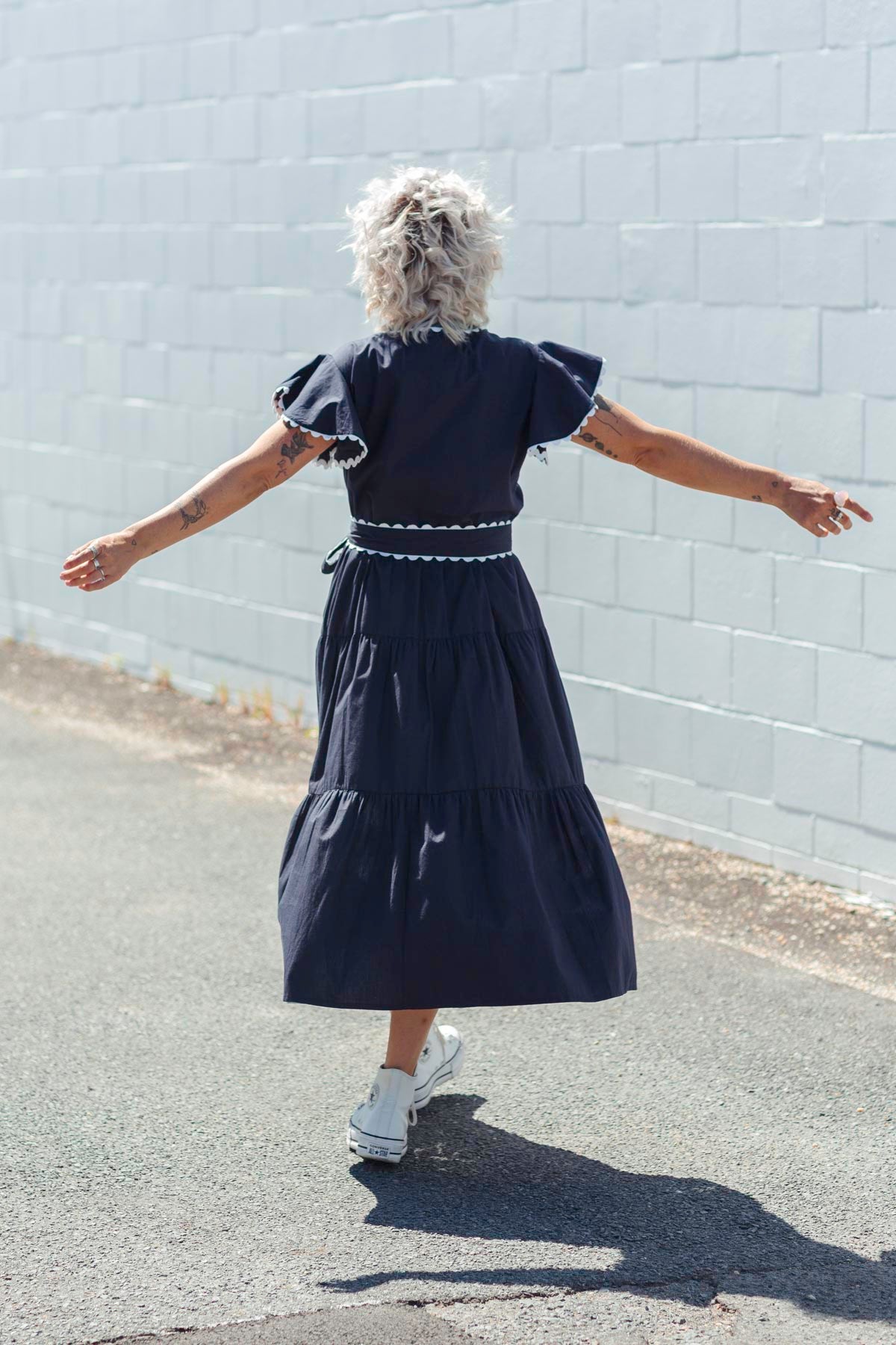 100% Luxe quality cotton, functioning buttons at the bust, fully tiered skirt, mandarin collar and beautiful ric rac hemming on the sleeves, base of the skirt and optional fabric belt, making this all new stunner an absolute showstopper!