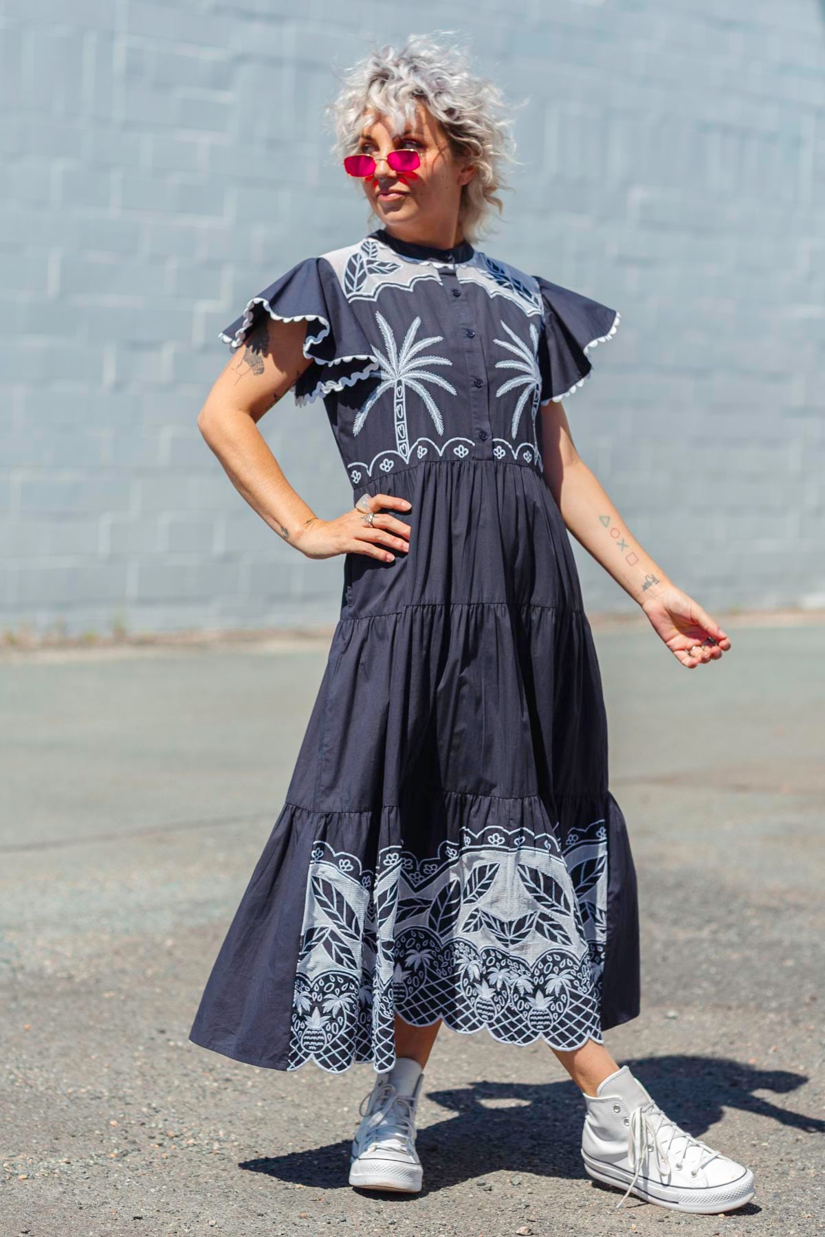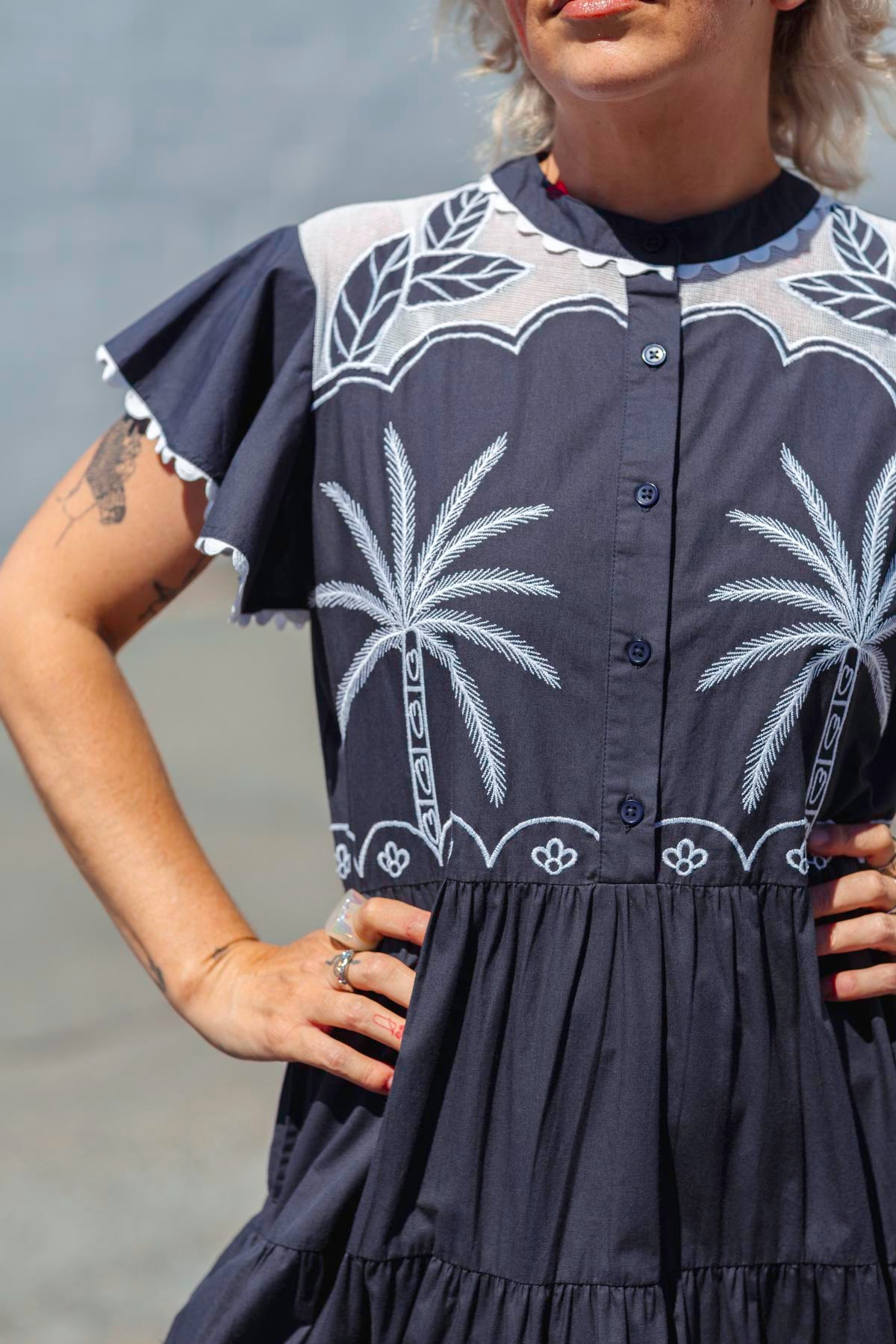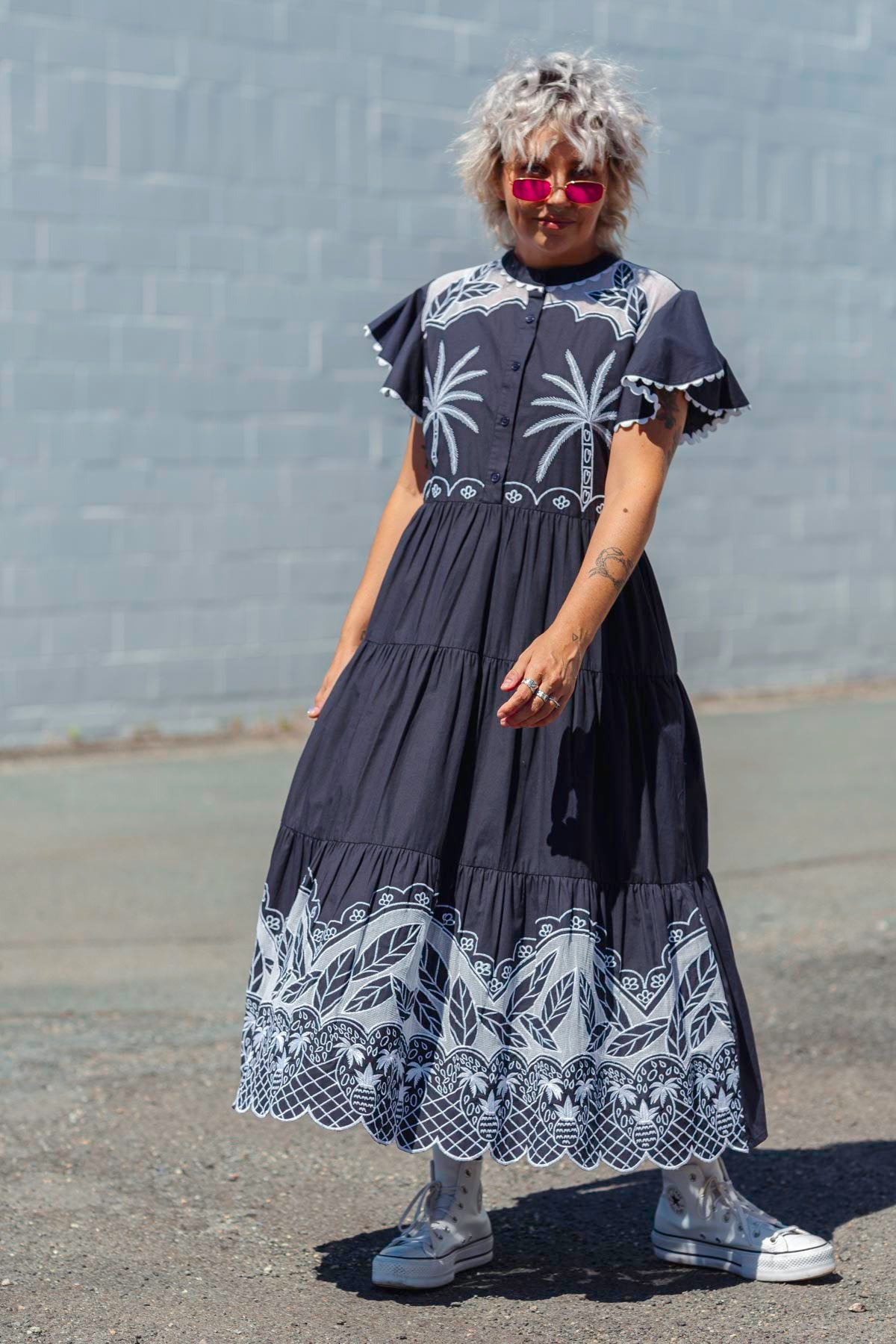 Gorgeously ornate stitched print in white on a deep french navy base, and is that pineapples we see on the base? Our all new LUCY DRESS is such a sublime new arrival that we hope you love as we do!
