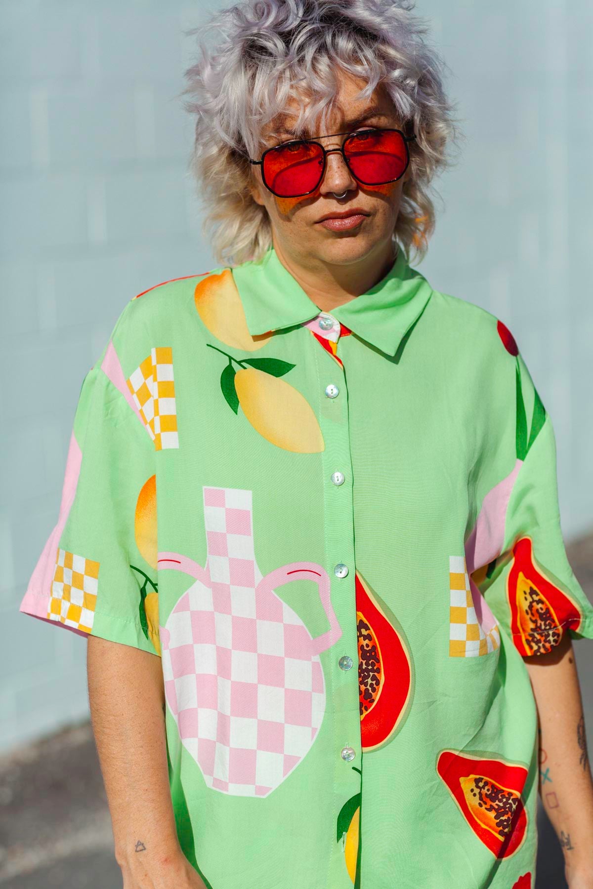 Obsessed with this beautiful shirt! Material is beautiful and structured. The little cherry details are so fun!