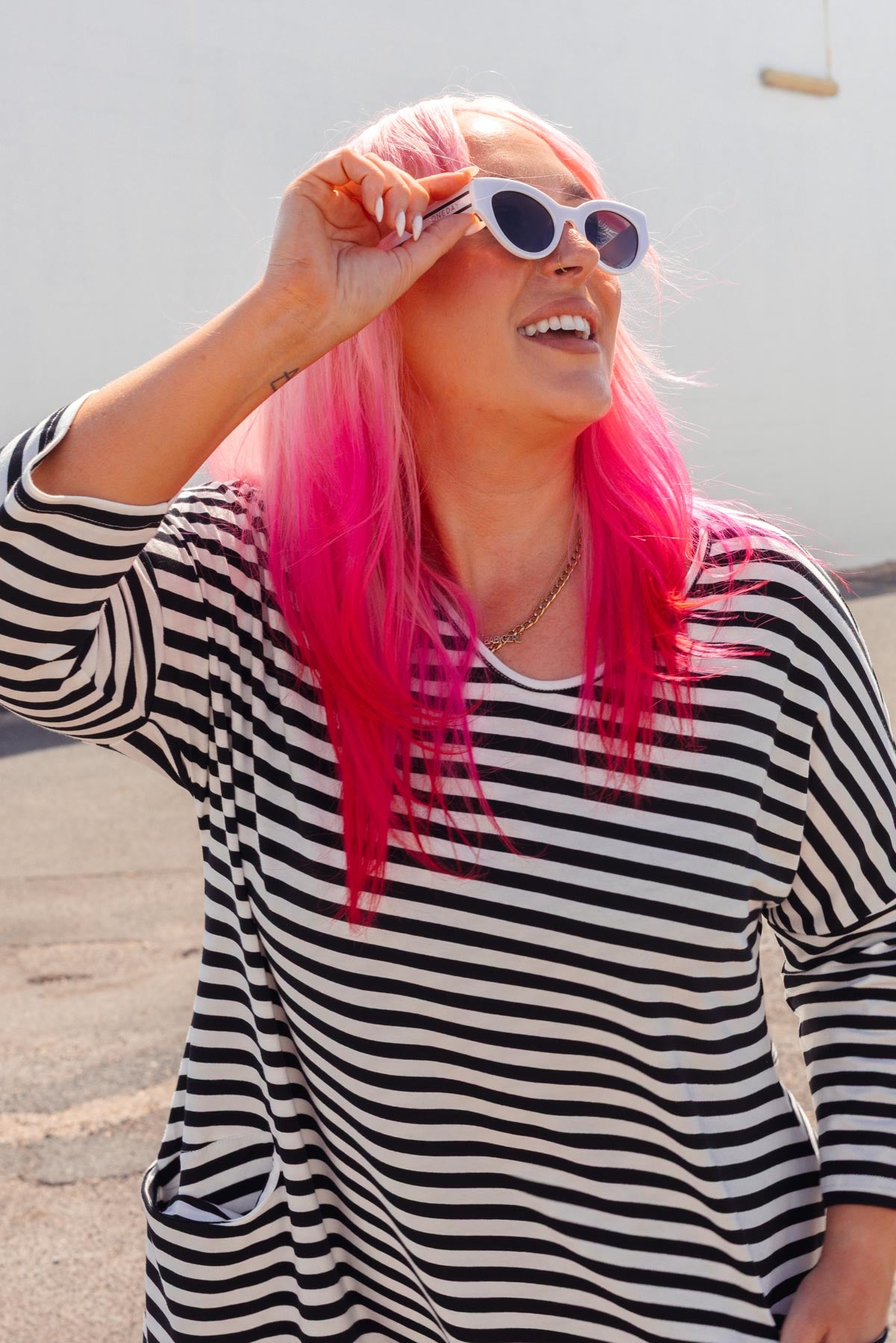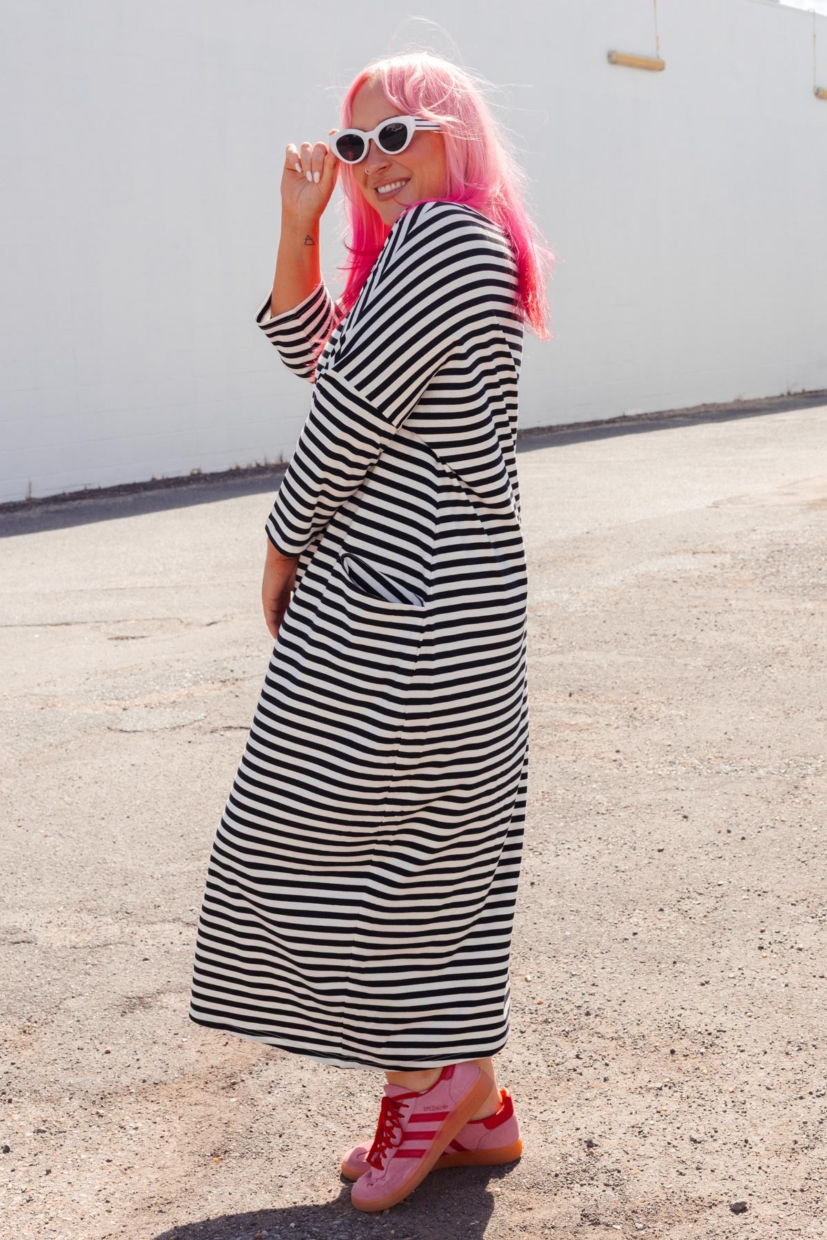 The perfect blend of cotton and spandex this striped beauty that has you covered for school pick up as well as lunch with the ladies.
