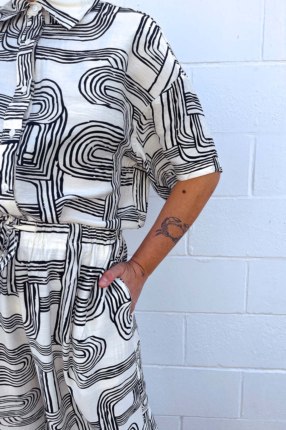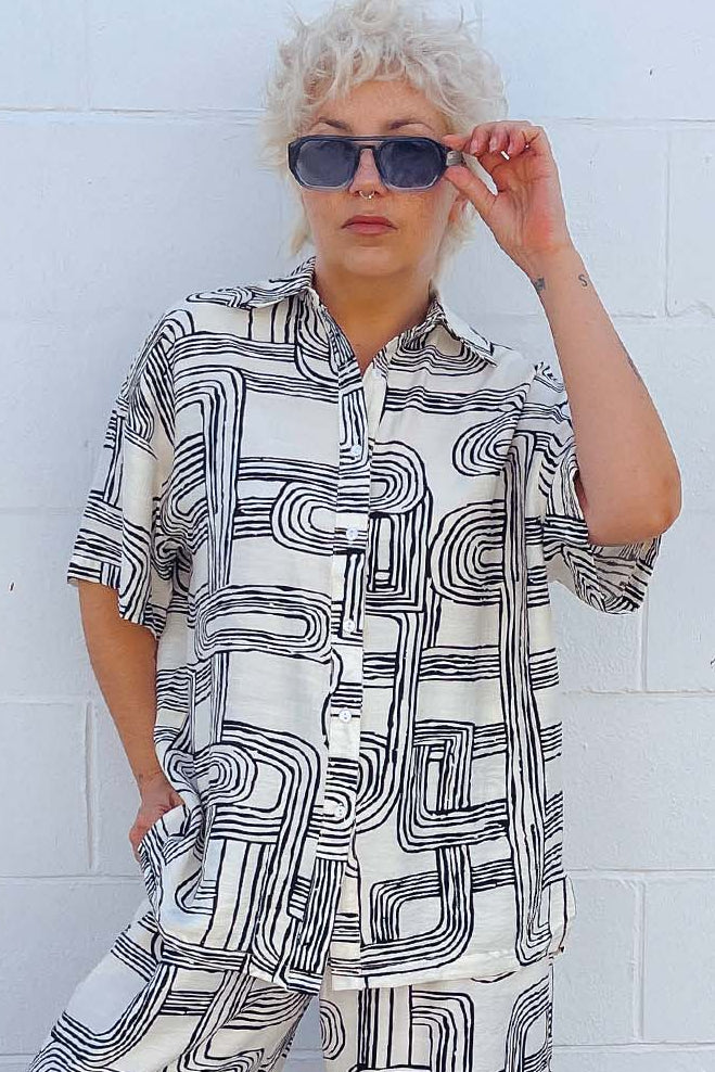 Off white base with black geometric details, this shirt offers the best relaxed style & shape, in a LUXE viscose, rayon blend, functioning buttons and such a cute addition to your wardrobe.