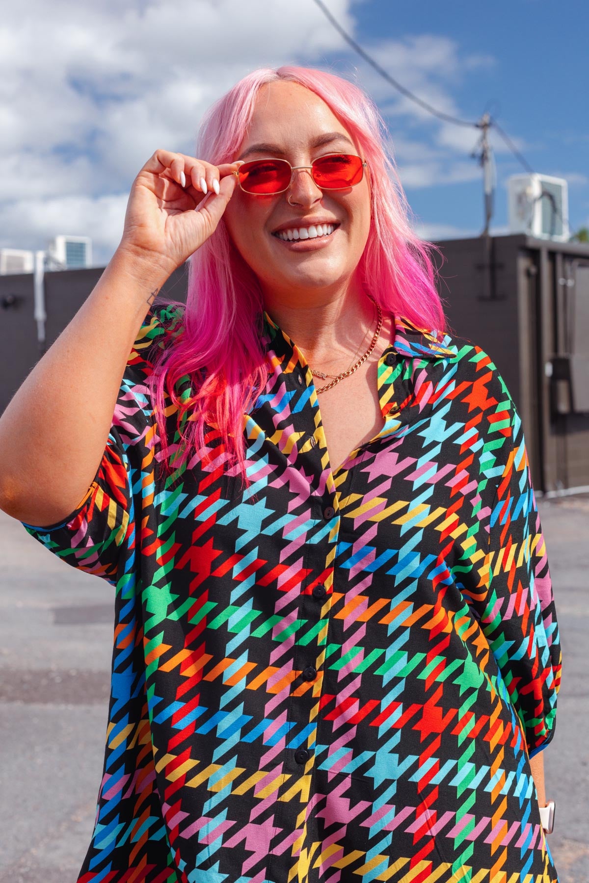 A black base to really make the rainbow print pop in a classic and ageless houndstooth print with a lot of colour to really make it sing. Check out this style as well as the matching RAINBOW HOUNDSTOOTH PANTS in our BRIXTON style to match perfectly with this shirt.