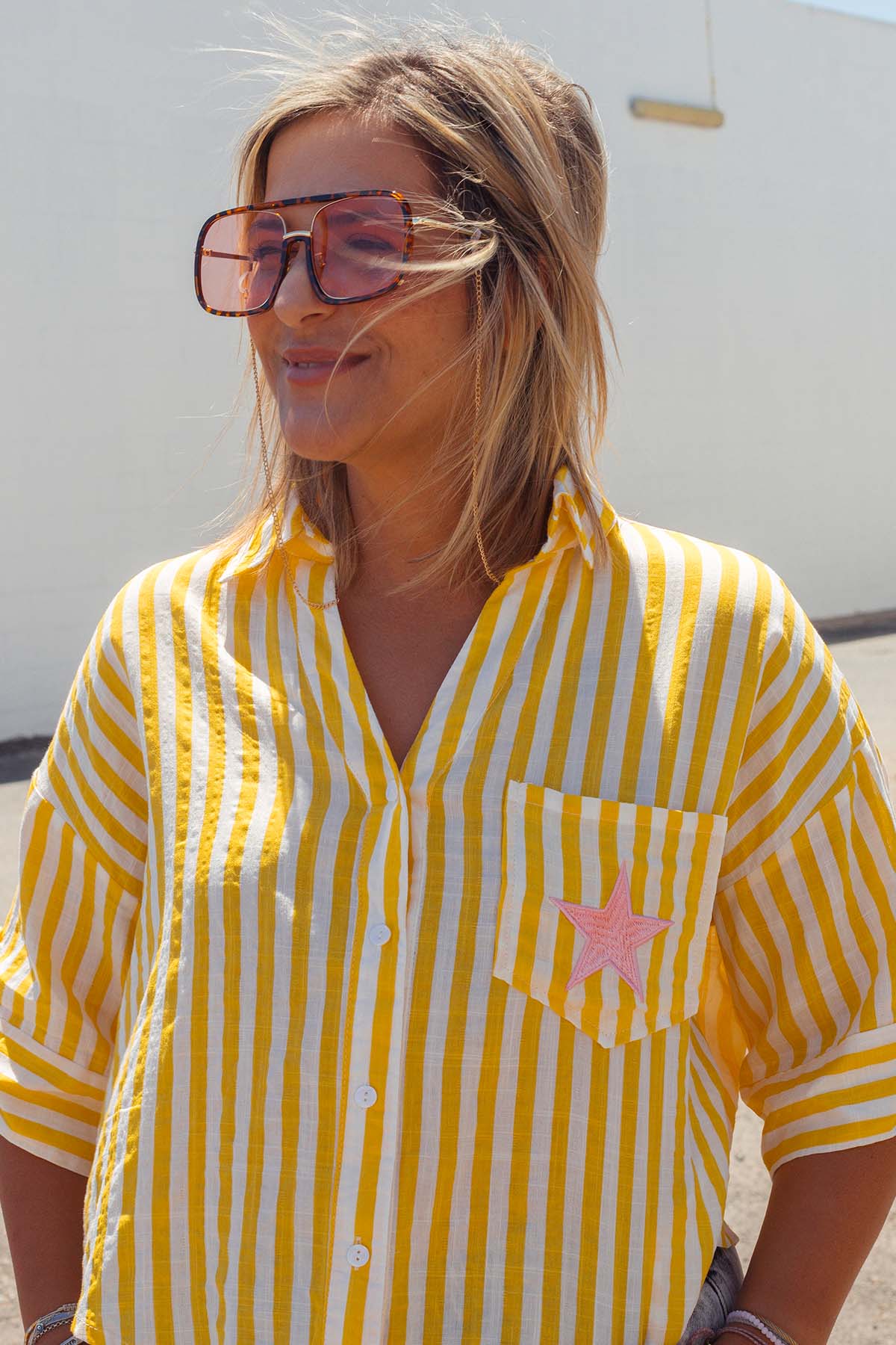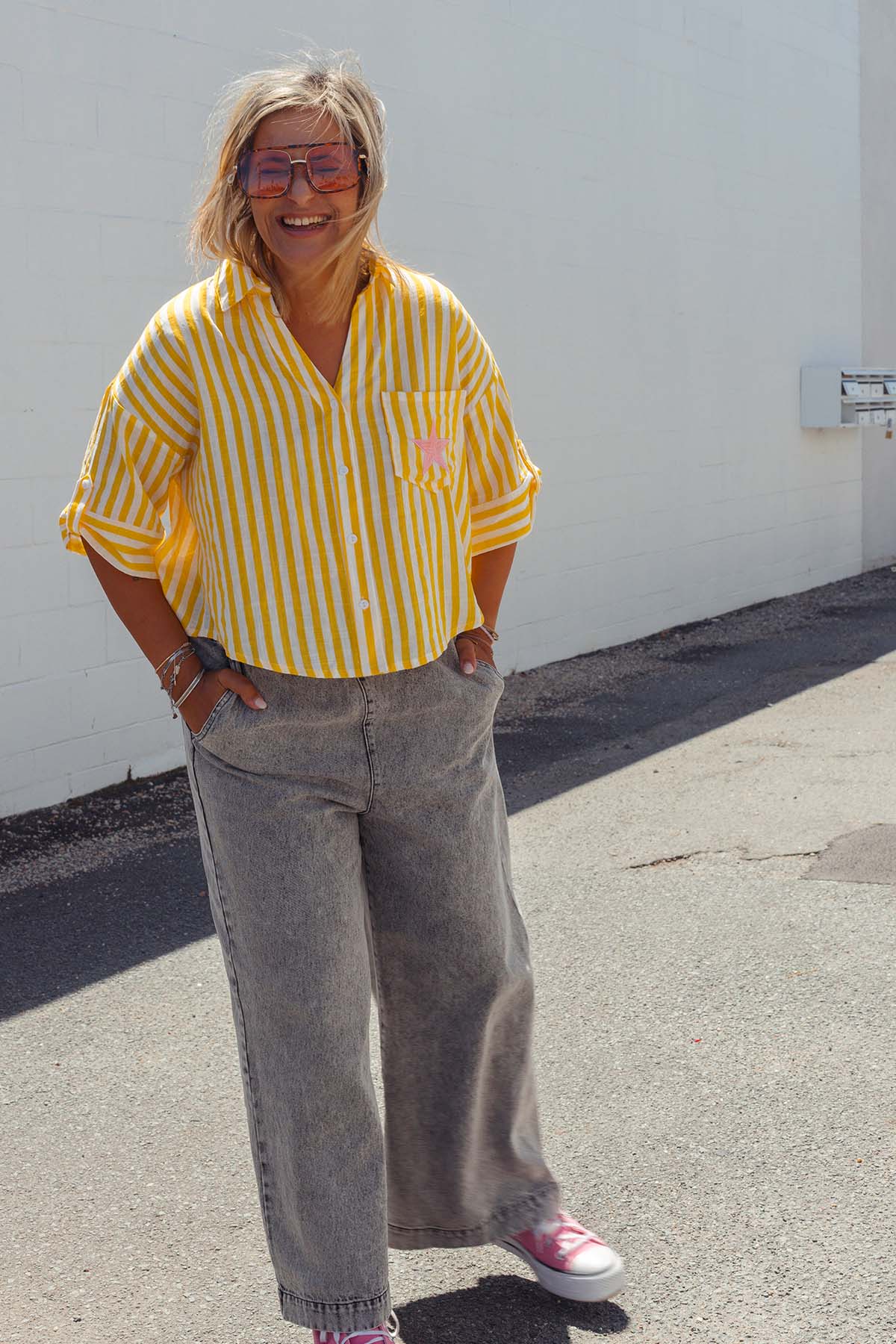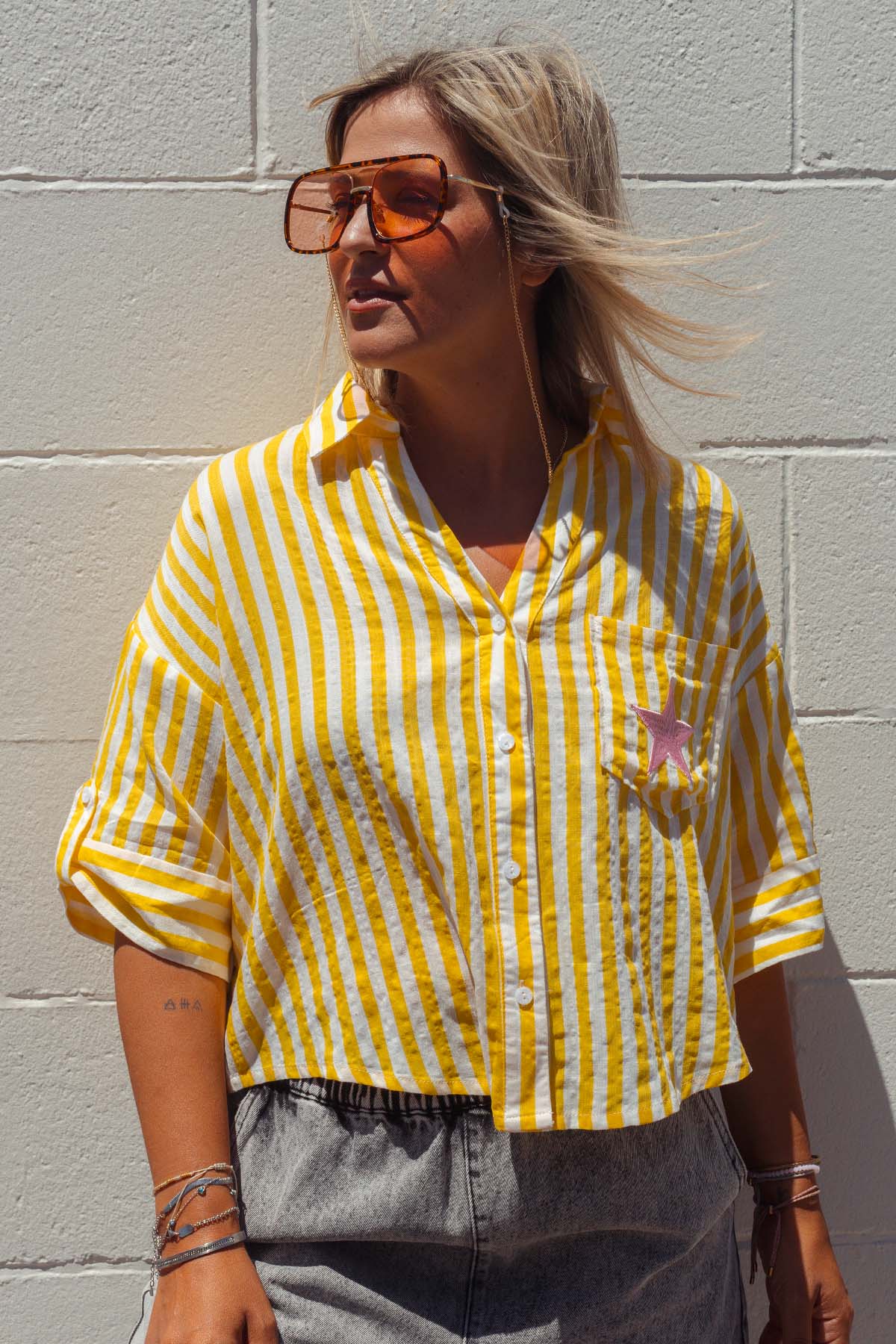 The BEST solution when you are sick of tucking the front of your shirt is a great semi cropped top, with good coverage and a great boxy shape... say hello to the all new EVE SHIRT a 100% LUXE cotton beauty that comes in a GREEN or YELLOW STRIPE.