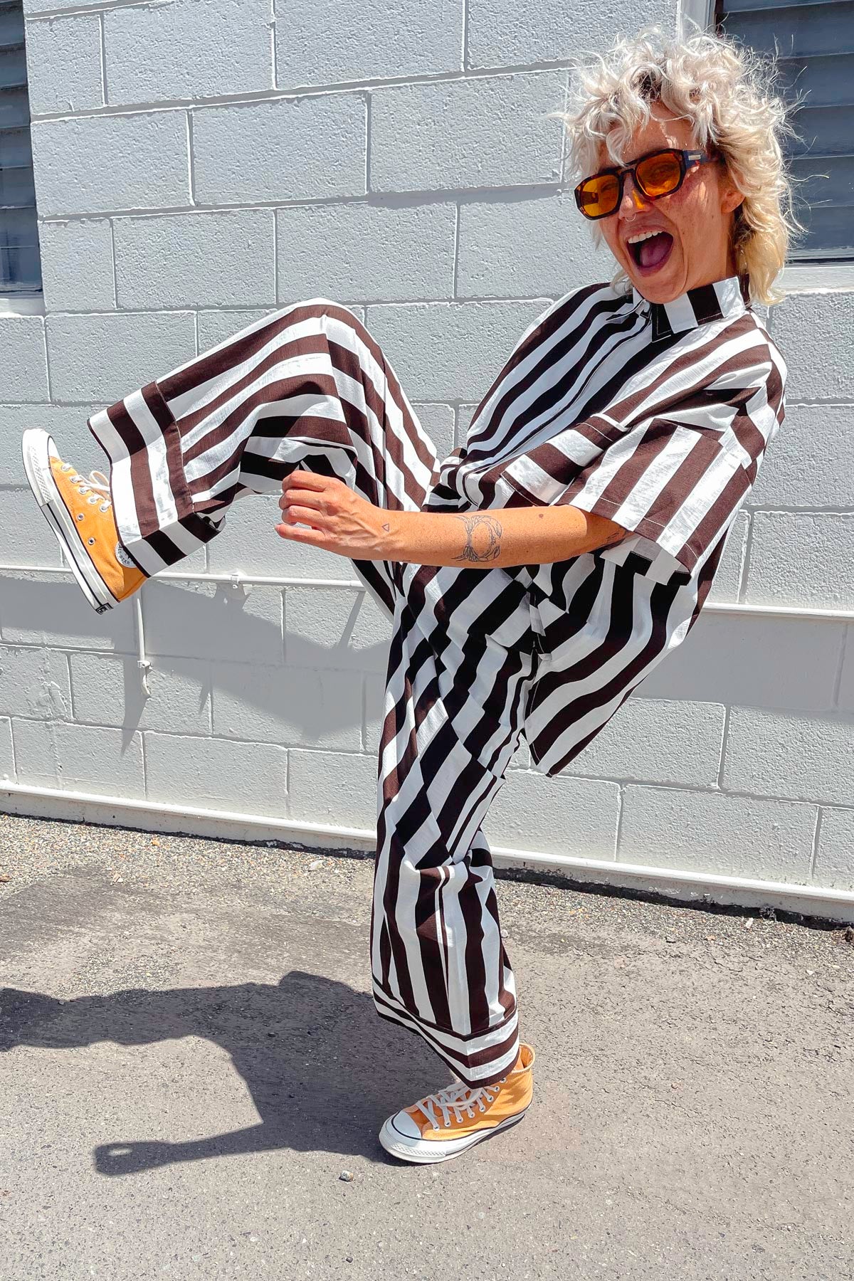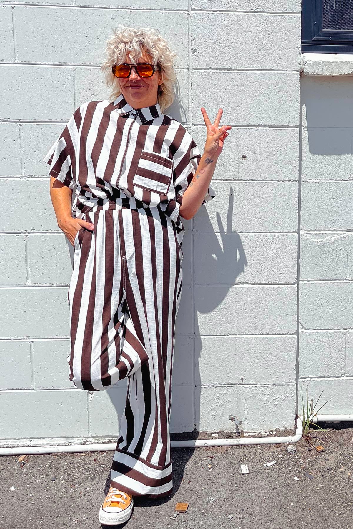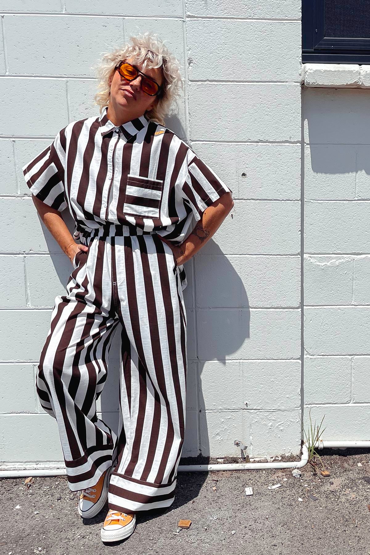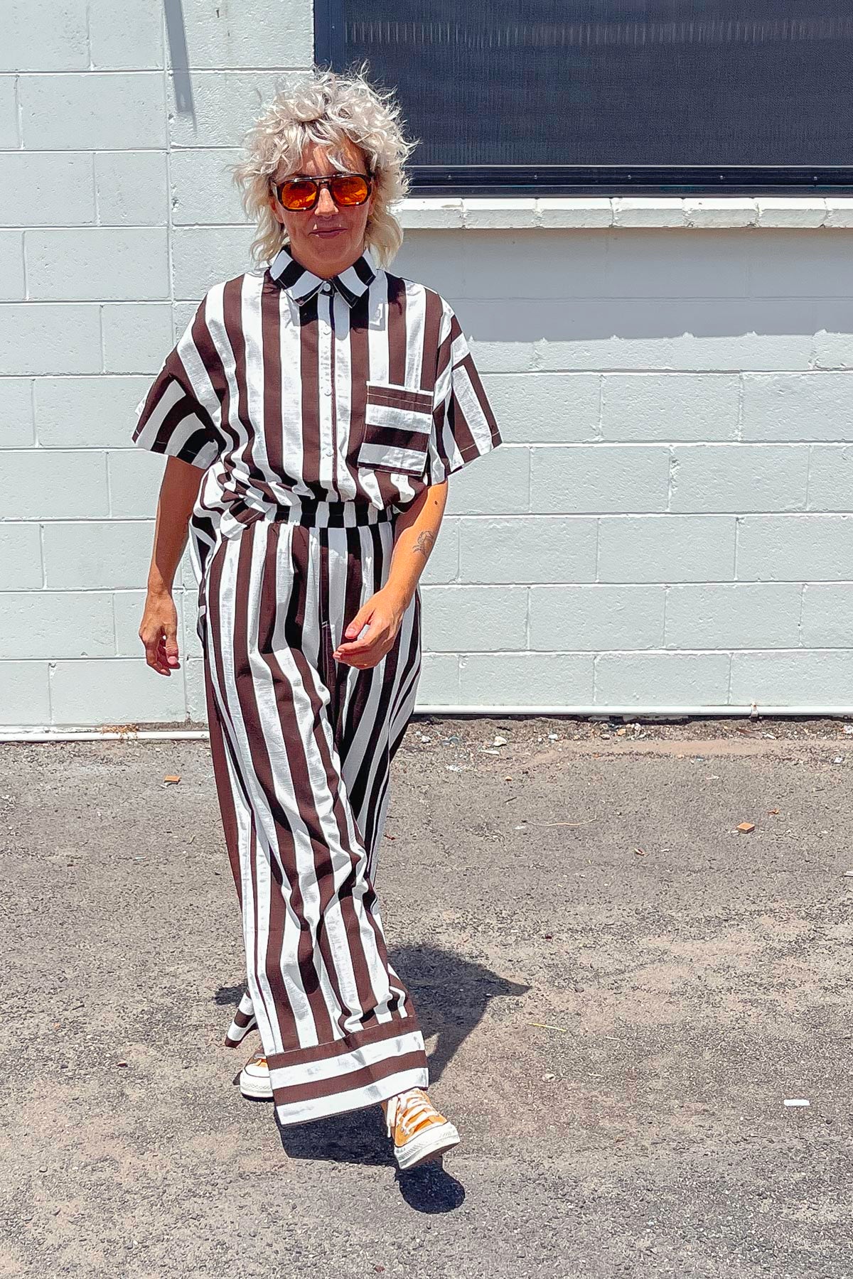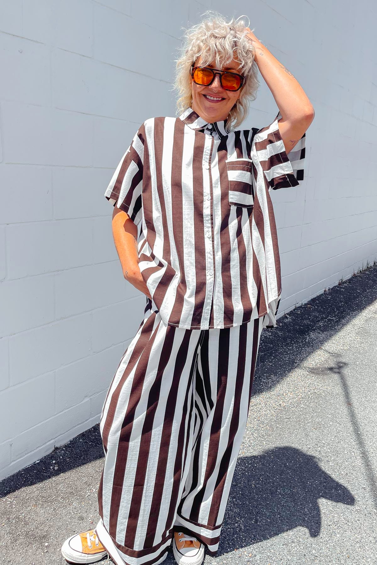 What a fab addition to your summer wardrobe, a cool as anything, chic and gorgeous outfit, our stunning new HALLIE PANTS in a beautiful chocolate brown STRIPE that has a  matching SHIRT if you are wanting to feel amazing and have a co-ord moment.