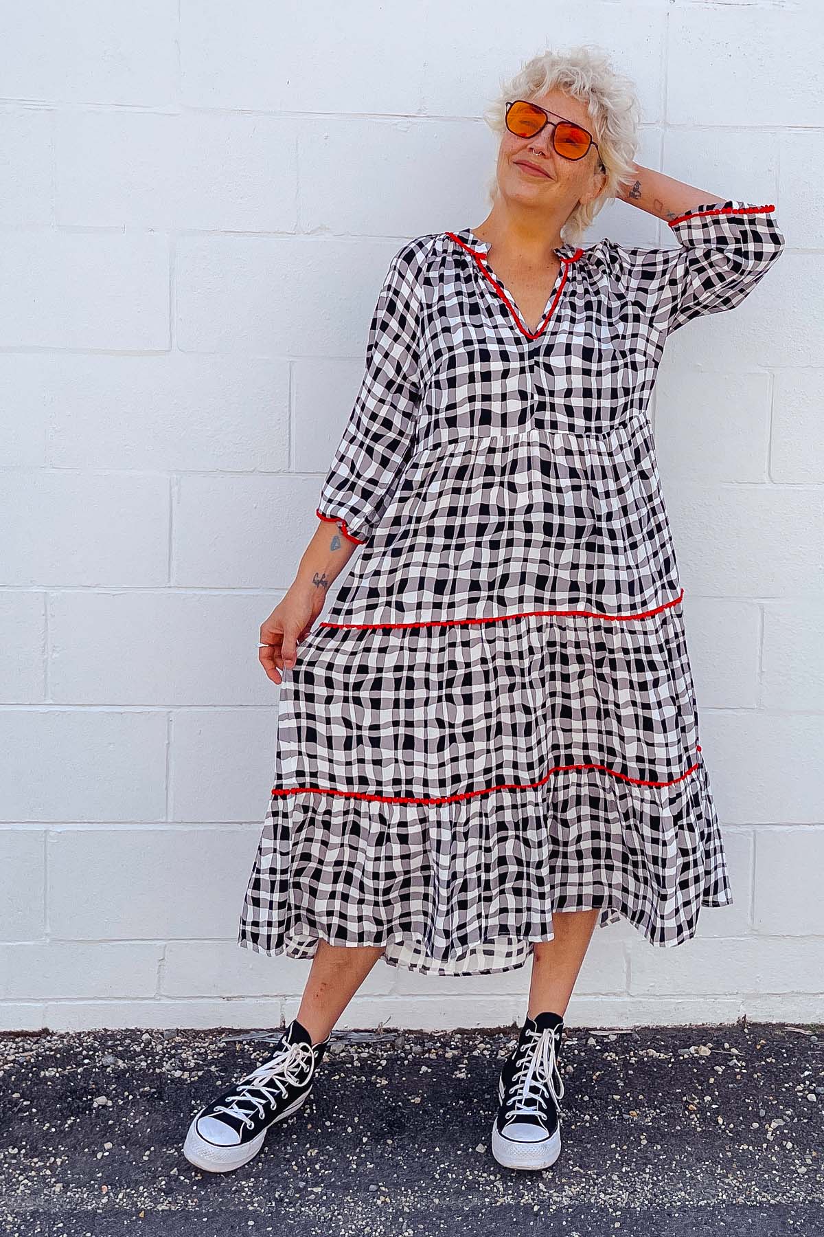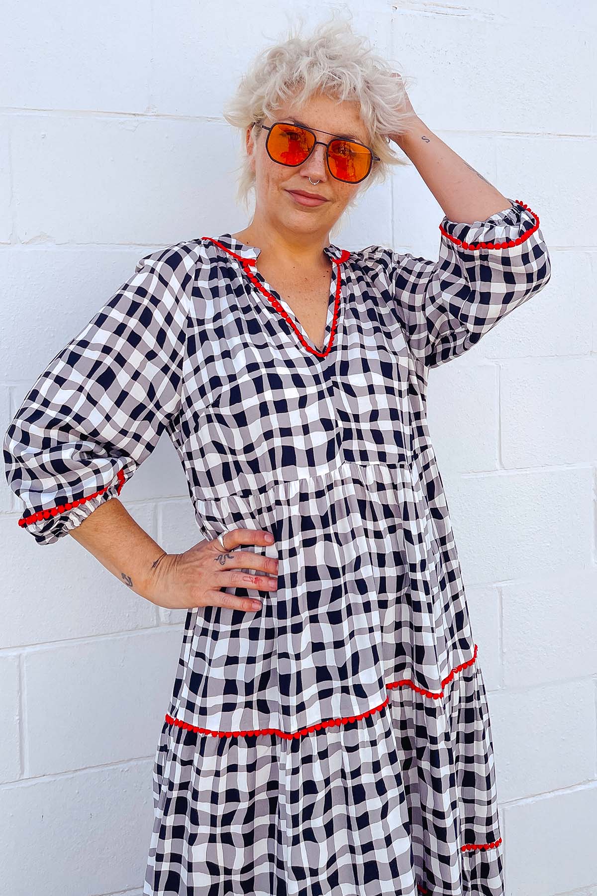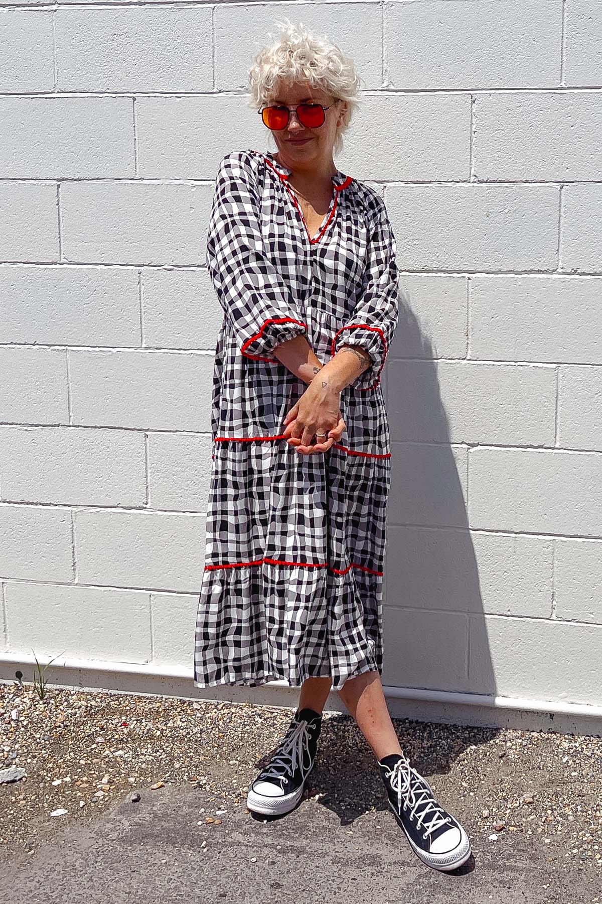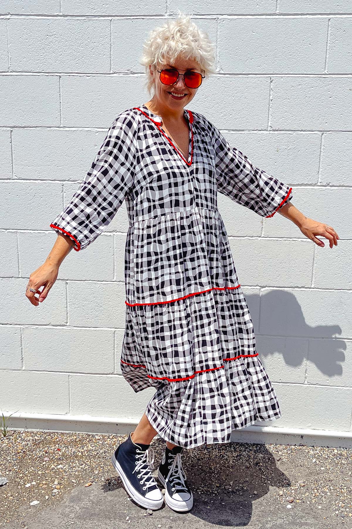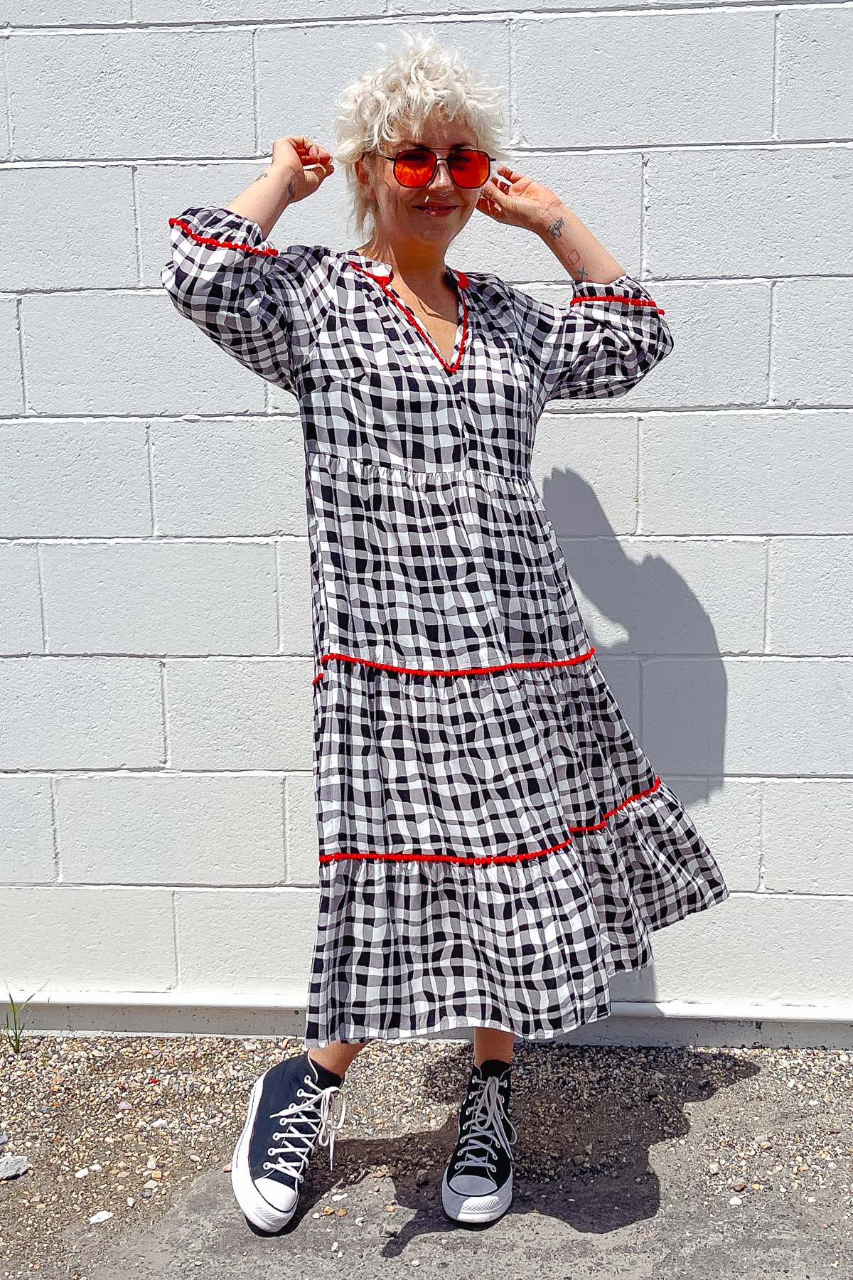 Classic Black & White gingham with a slight twist, the all new KEIRA DRESS is a stunning  long beauty, with red trim detail and a shape you’re gonna love!