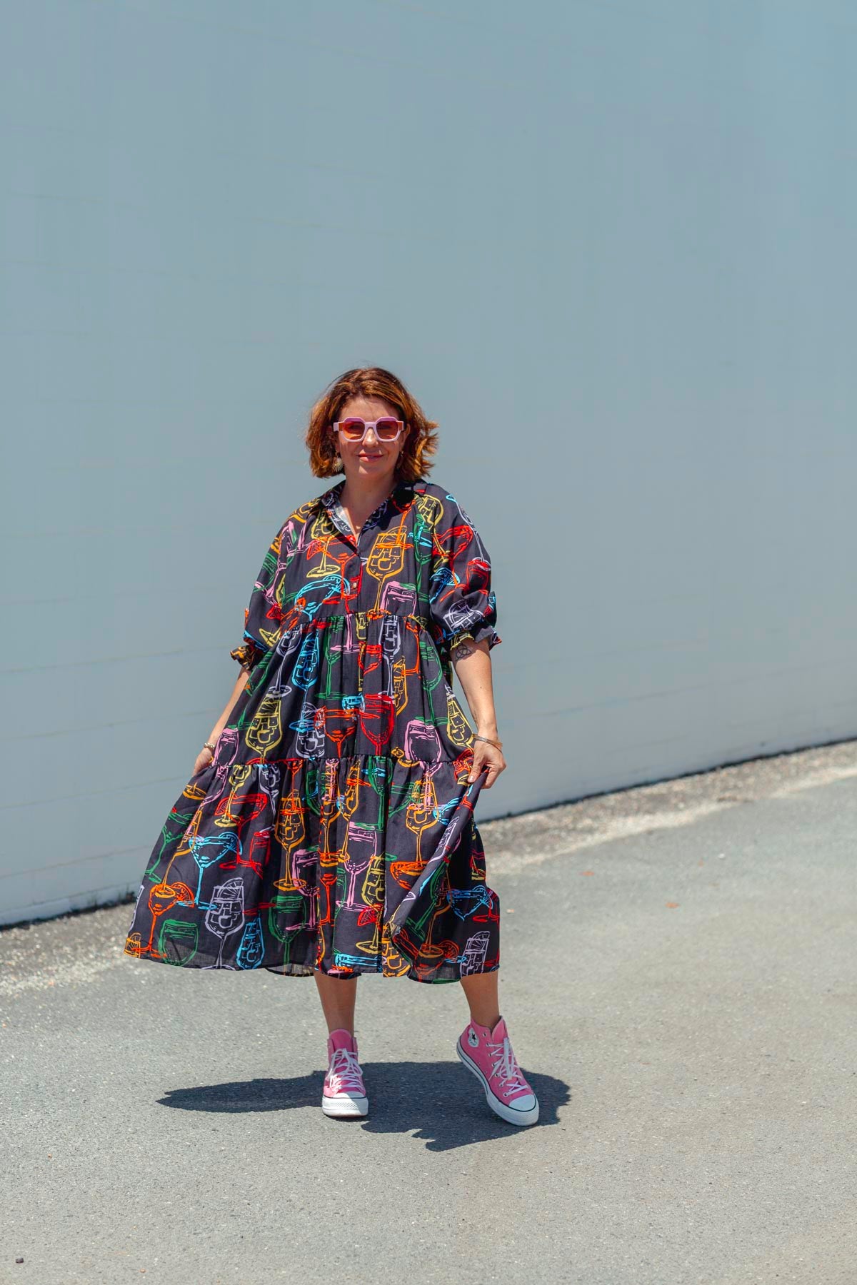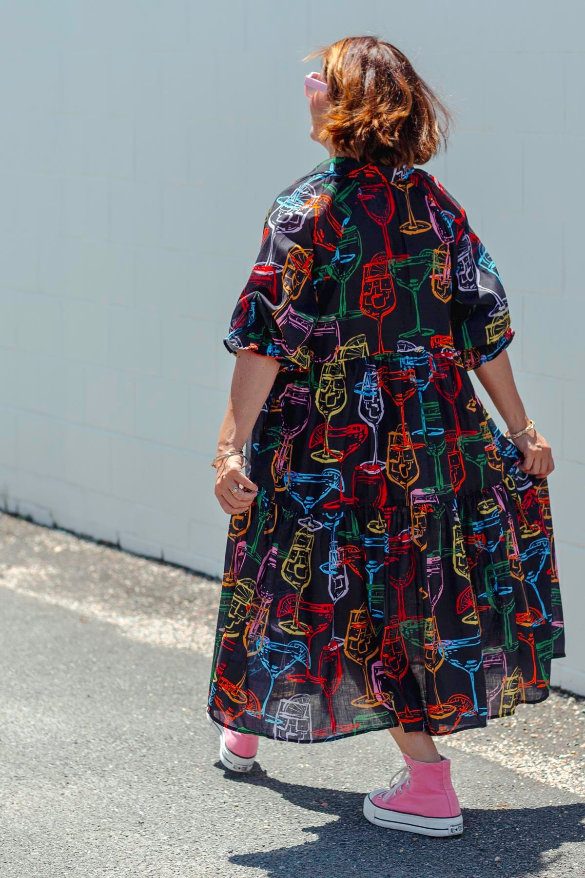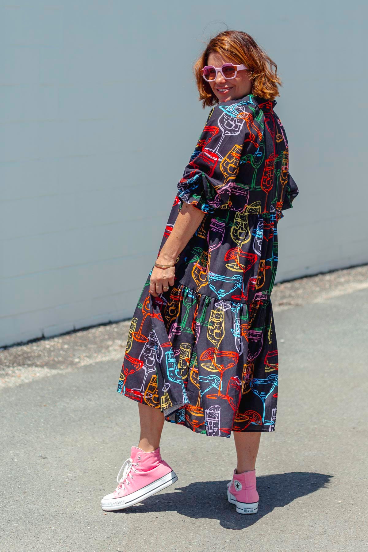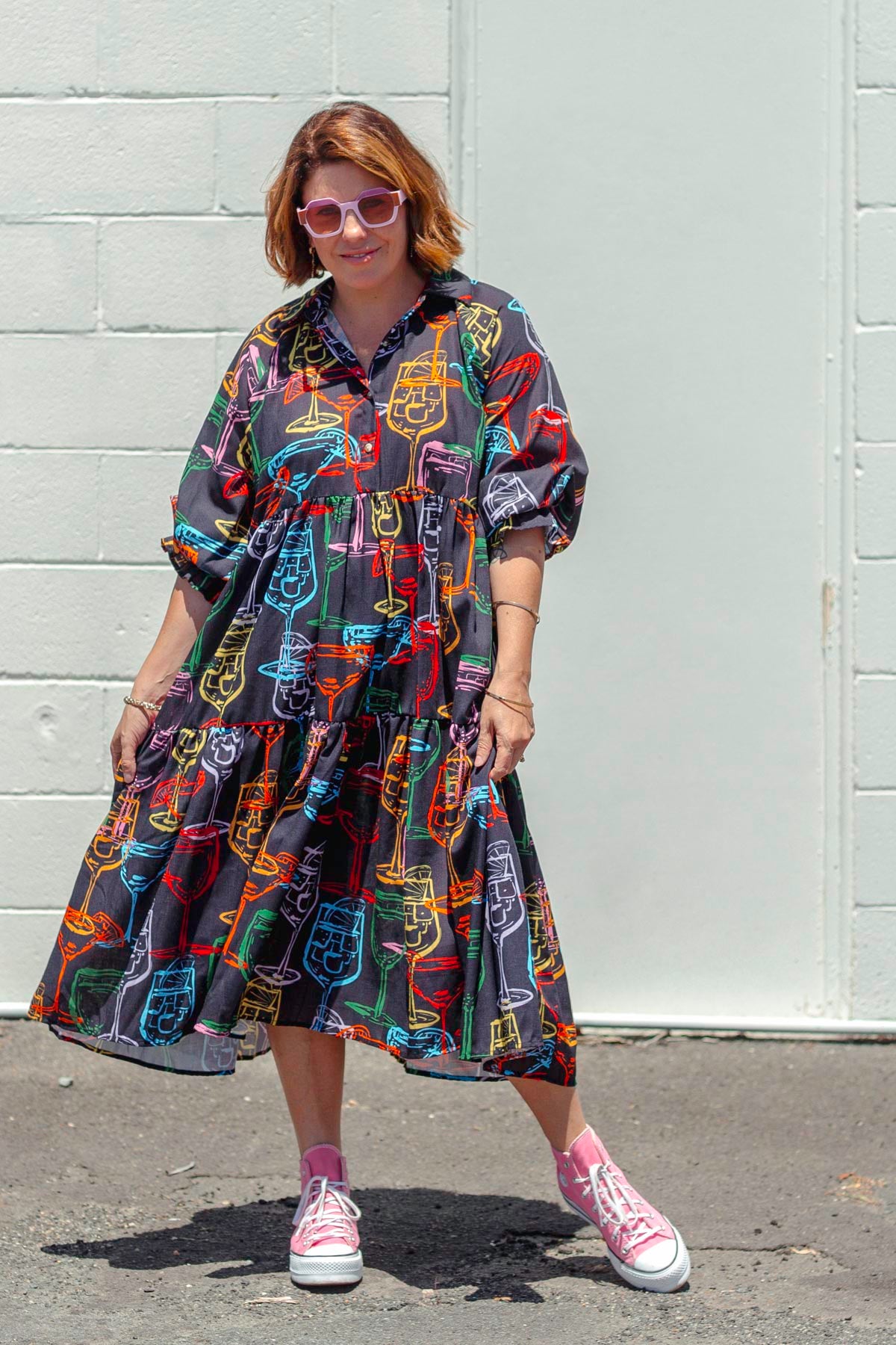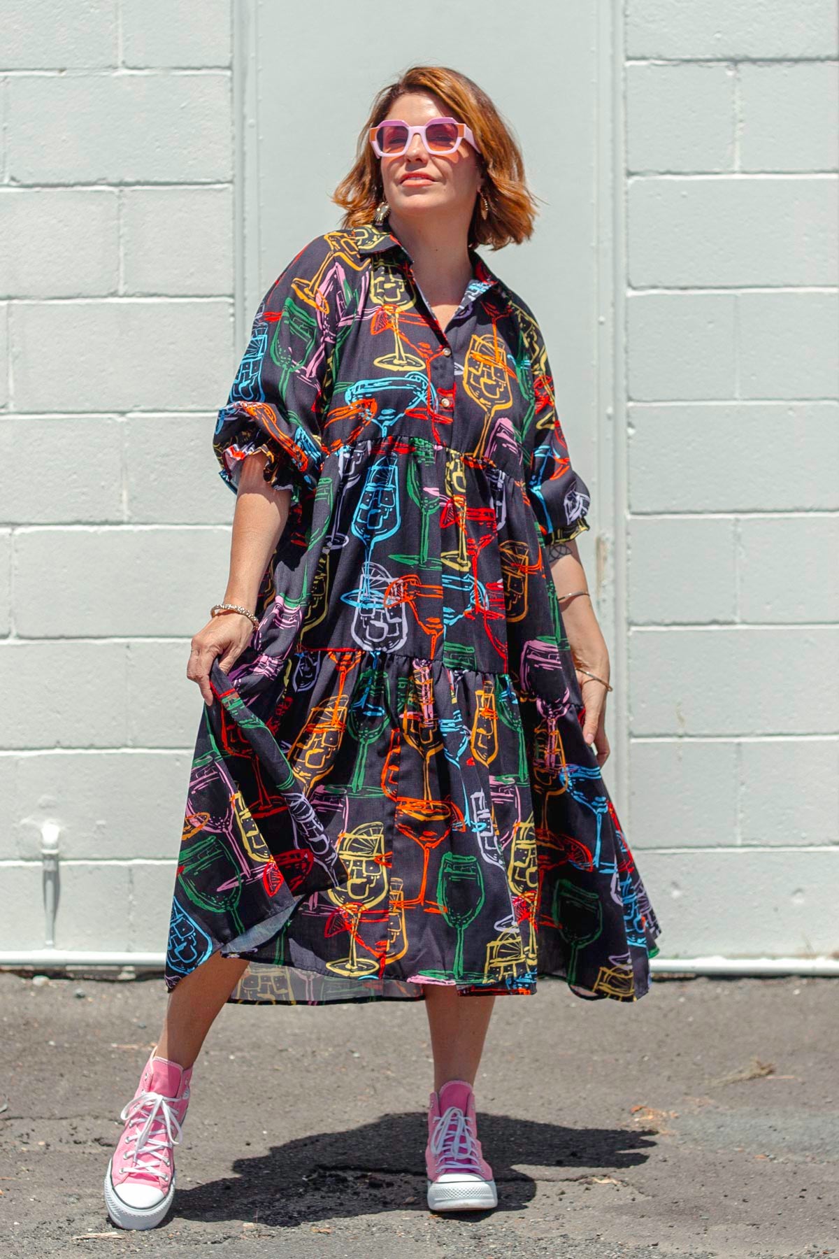The coolest shape, paired with a stunning new majestic print, the crowd favourite 'WINNIE DRESS' is back. This dress is LUXE with flattering sleeves, buttoned v-neckline, perfect length, pockets and a dramatic tiered shape, this is such a great piece.